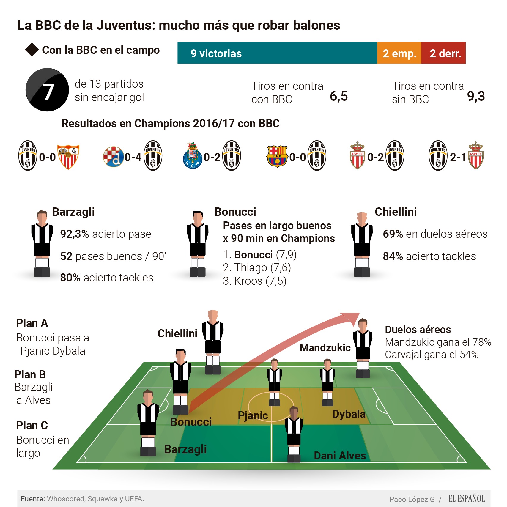 Pese a no haber estado juntos toda la temporada, los datos muestran que la BBC atrás sigue funcionando: en 7 de los 13 partidos que han disputado Barzagli, Bonnuci y Chiellini juntos han mantenido la puerta a cero. Y, más allá de la seguridad atrás, alinearles da más opciones con balón para evitar una presión en la salida –donde la Juventus podía verse más limitada-.