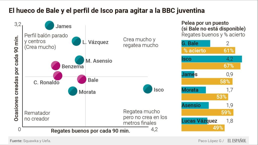 Si observamos las cifras de regates exitosos cada 90 minutos (en Liga y Champions) de la BBC y sus suplentes, nos deja muy claro que Isco tiene la obligación de agitar a los de Allegri y convertirse el elemento que demuestre que el doble pivote Pjanic-Khedira tiene sus problemas obligando a ajustar a la defensa italiana y hacerles dar dos pasos al frente.