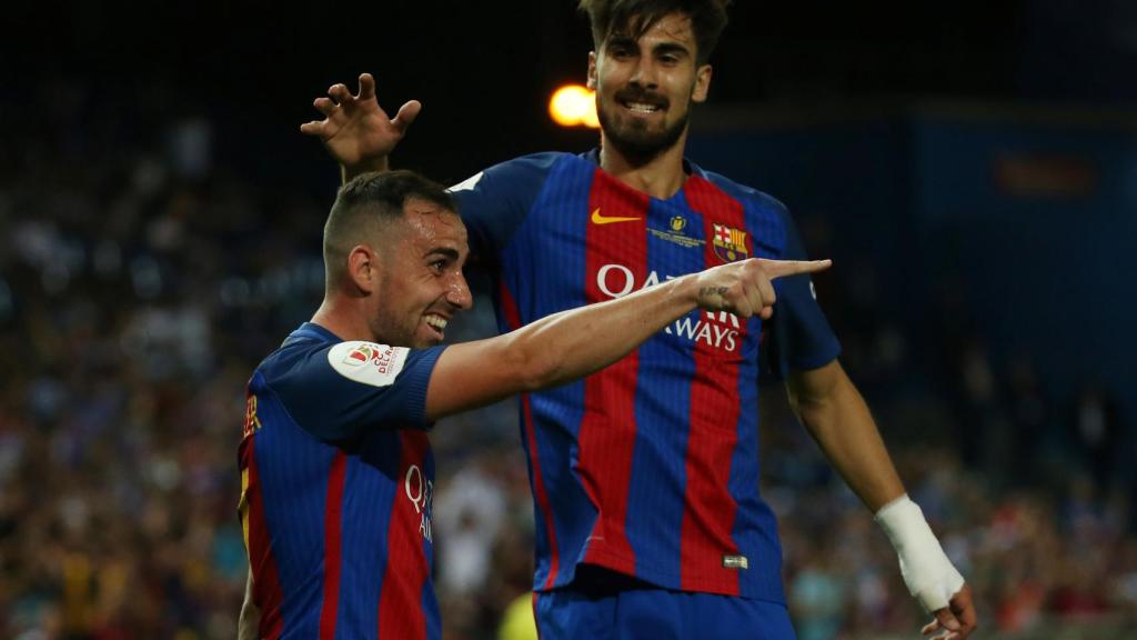 Así ha celebrado el Barcelona su tercer gol del partido. Aquí, los dos protagonistas del gol: André Gomes, que pone el balón y Alcácer, que marca el gol.