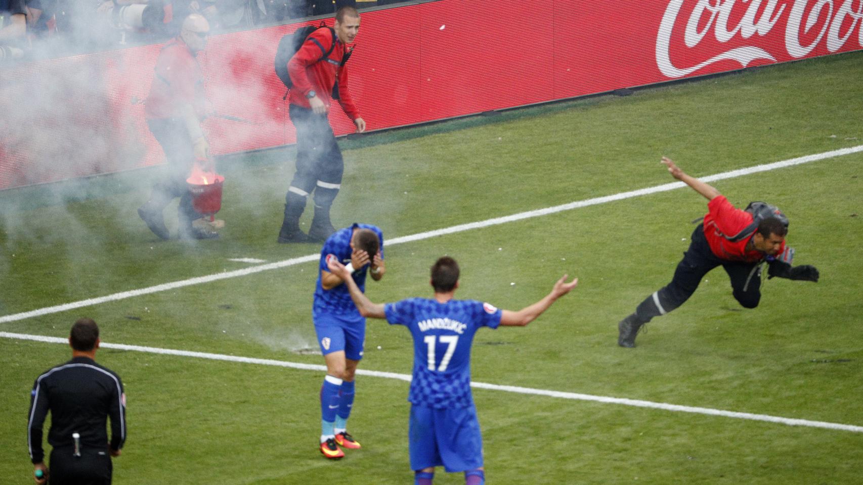 Los seguidores, cuando su equipo ganaba (2-1) en el partido contra la República Checa, pararon el partido lanzando las mencionadas bengalas desde uno de los fondos. Croacia empató (2-2).