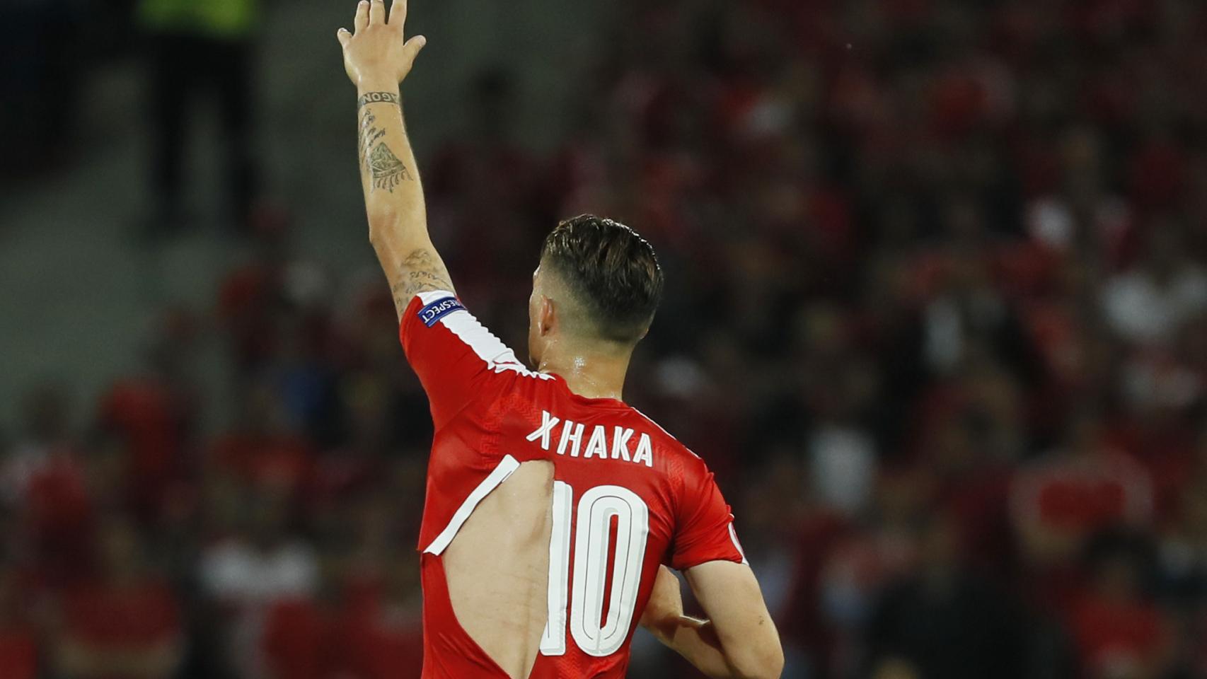 Xhaka se señala su camiseta rota en el Francia - Suiza. Reuters