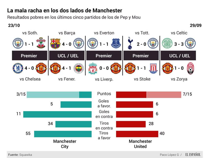 Una serie de resultados que parece más sangrante aún para el Manchester United si atendemos a la entidad de los rivales. Las cifras citizen están muy influidas por la gran bofetada que fue el 4-0 del Camp Nou. Un clima enrarecido en los dos equipos de la ciudad pero causas muy distintas.