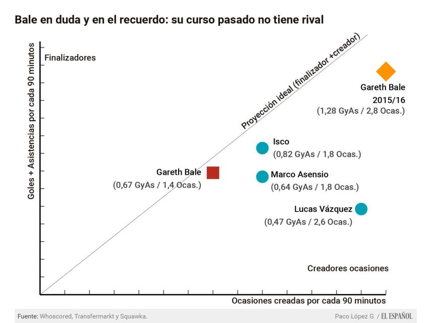 Con los números de Gareth Bale, Isco, Lucas Vázquez y Marco Asensio expuestos, se puede decir que ninguno de ellos destaca de una manera espectacular. Aunque esos datos reflejan que Bale sigue sin estar muy fino, es el que más dispara, más regatea, menos balones pierde, más intercepta y el más dominante de todos ellos en el juego aéreo. No está bien pero sus reemplazos aún no llegan al nivel suficiente como para pelearle el puesto realmente. Tiempo y continuidad es lo que necesita el galés a la espera de recuperar confianza y protagonismo.