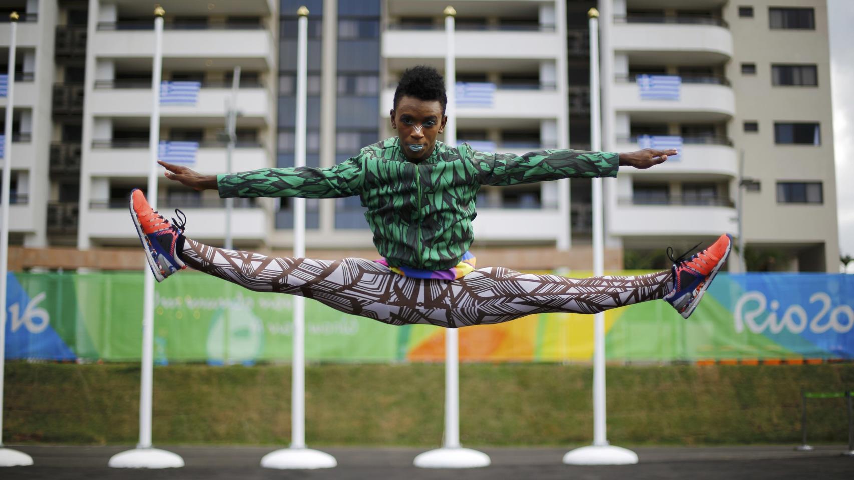Uno de los participantes de la ceremonia de apertura ejecuta un salto durante una prueba.