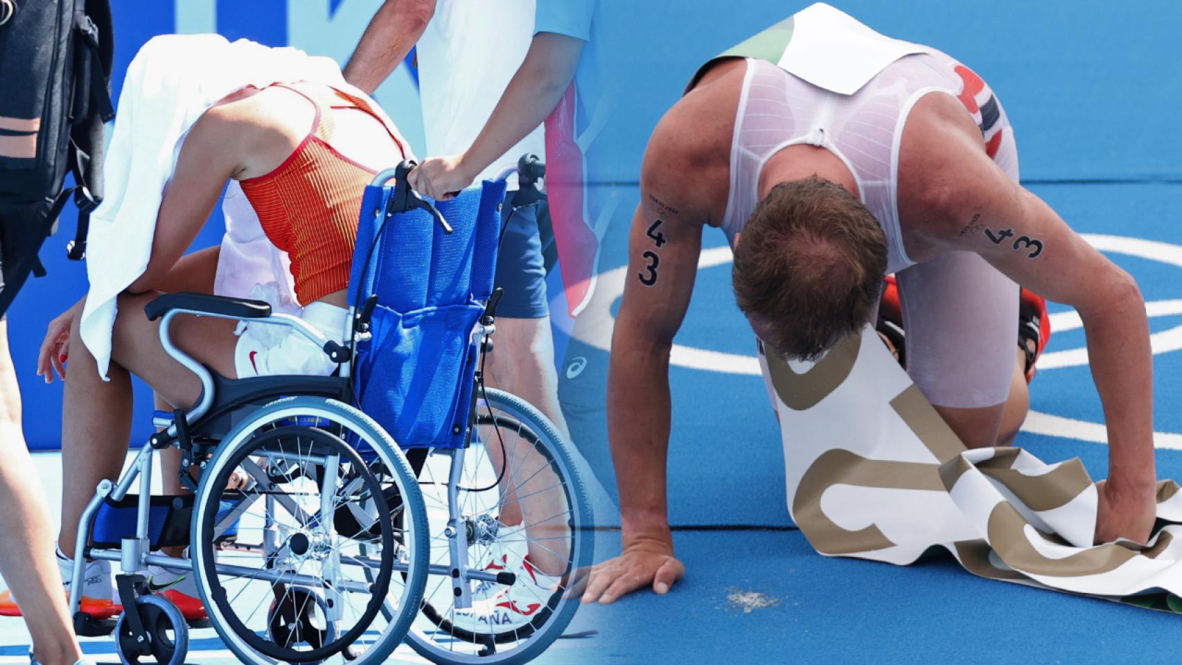 Kristian Blummenfelt, ganador del triatlón masculino, es atendido tras cruzar la meta y derrumbarse debido al calor y la humedad