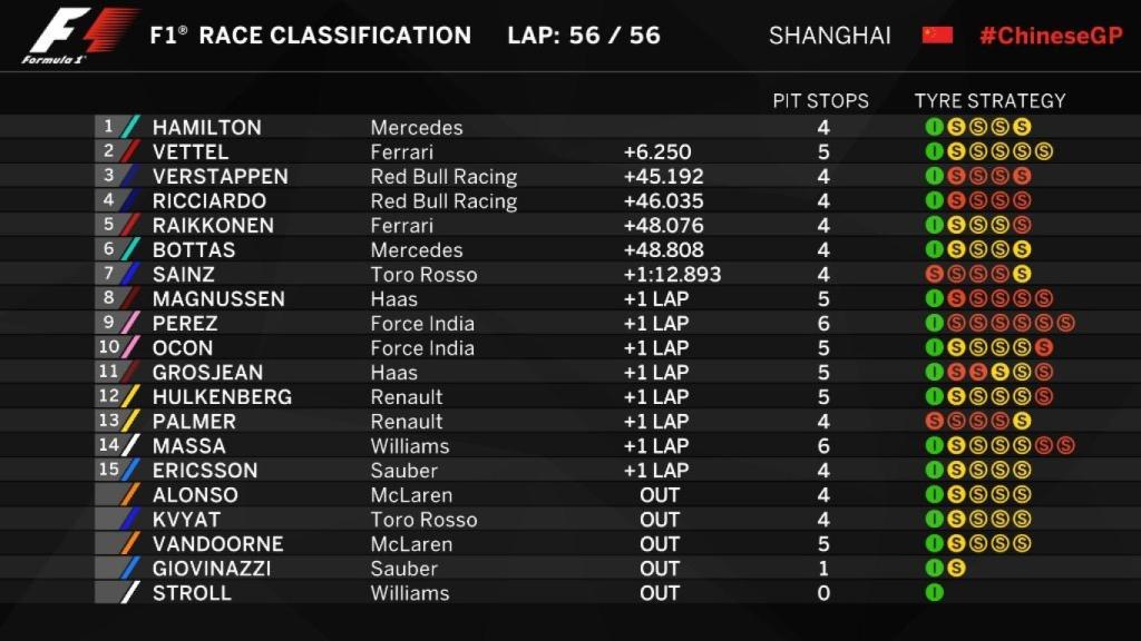 Entra Hamilton a boxes. Es líder de carrera y muy mal se le tiene que dar para no ganar hoy en China. Sale por delante de Vettel, gran movimiento de Mercedes.