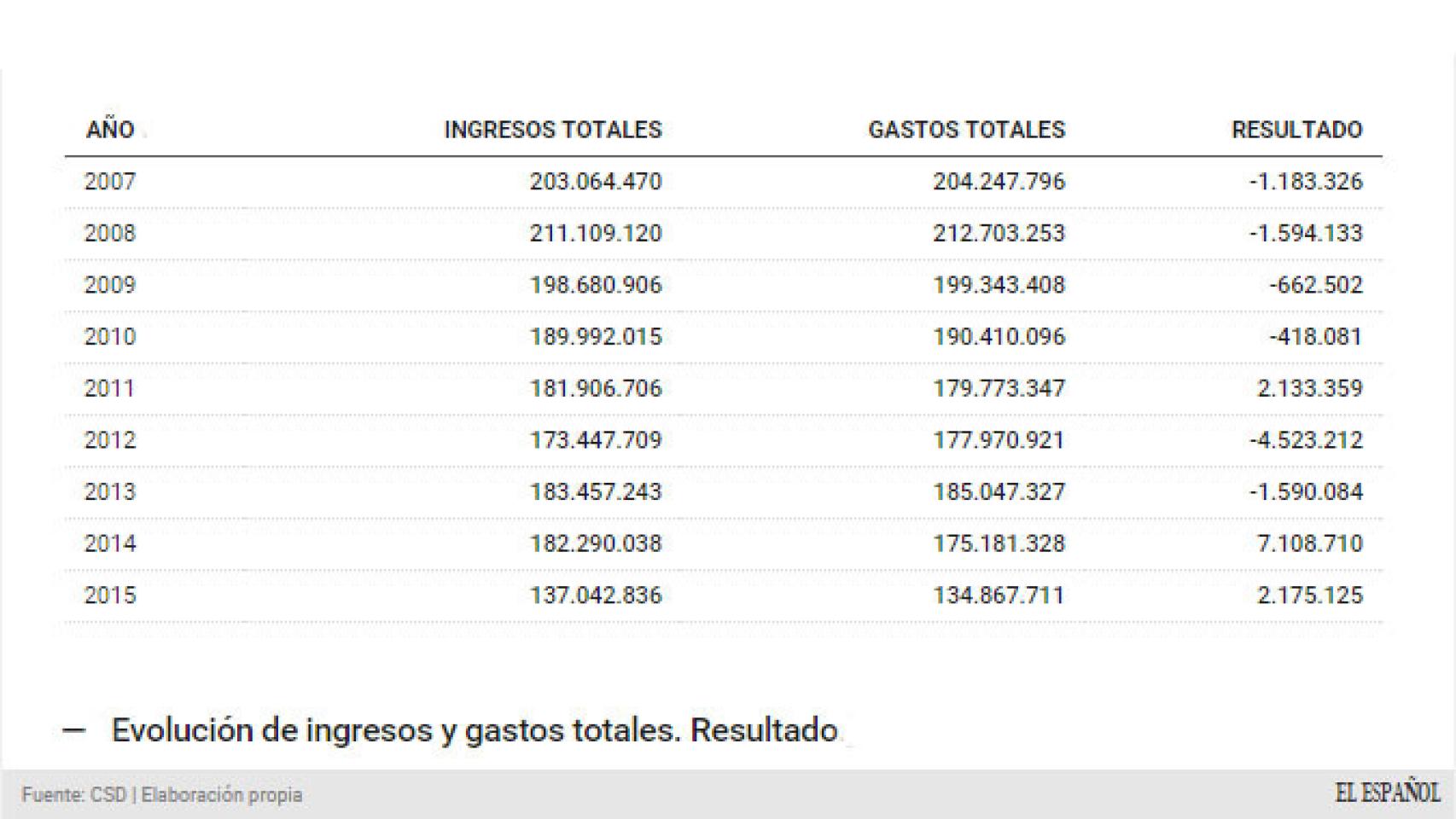 Después de dos años en donde se celebraron en España diversos campeonatos internacionales (Mundiales de Balonmano y Natación y Tiro Olímpico en 2013 y Mundiales de Baloncesto, Vela y Tiro Olímpico en 2014) que condicionaron al alza las cifras de ingresos y gastos totales, se ha recuperado en 2015 la línea descendente que se venía marcando en ambas magnitudes.
