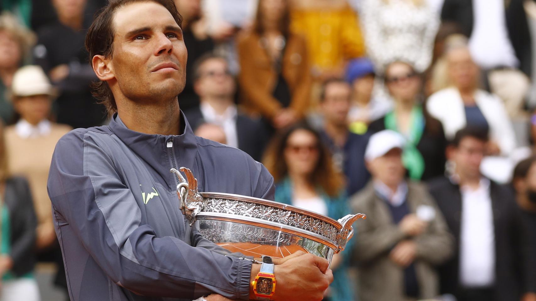 Rafael Nadal sonríe y mira la Copa de los Mosqueteros que le acredita como campeón de Roland Garros
