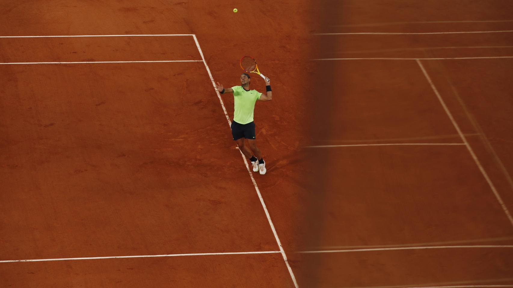 Nadal mientras saca de fondo en la tierra batida de Roland Garros
