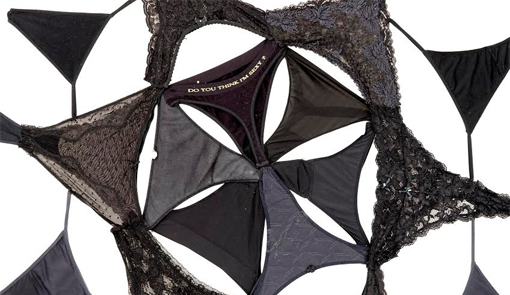 R.- De España y de fuera, sí, hay bragas de todo tipo, de jóvenes, de mayores, de gordas, de delgadas, festivas, sosas, tangas... Un trabajo que es también un muestrario de personalidades, de energías y de espíritus… Es una representación espiritual (un mandala) pero desde un objeto de uso cotidiano casi invisible, que no se muestra. Esa fina línea entre la espiritualidad y la ironía me gusta y me da qué pensar.