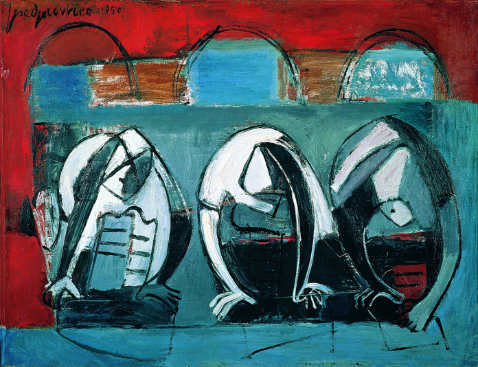 La sala que reúne pinturas de los años cincuenta logra transmitir muy sugestivamente la pulsión entrecruzada de ambos artistas en la primera conformación de su lenguaje maduro. Y como contraste, también para la producción de la década de 1950, se reúnen en la sala que obedece al título Laboratorios experimentales en papel obras sobre papel de ambos, enfrentando los collages de Vicente a las estampas de Guerrero. Sirvan esas impresiones de ejemplo para el complejo juego dialéctico que se ha sabido articular. No está de más mencionar la calidad de los préstamos: alcanza hasta pinturas tan importantes como Black Cries de Guerrero, y hasta la exposición por vez primera de un interesante collage desconocido de Vicente, perteneciente a la colección de Alberto Alcocer. Estas nupcias entre almas se celebran, así pues, a lo grande. Y los asistentes a la fiesta salimos de ella habiendo disfrutado, e incluso entendiendo mejor a cada uno de sus dos protagonistas, después de haberlos tratado juntos. La muestra se trasladará en verano al Museo de Bellas Artes de Oviedo y después al Centro José Guerrero de Granada. Un año entero para festejar la boda.