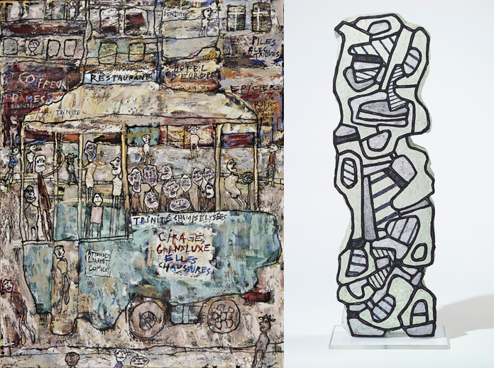 Dubuffet asentaría sus propias teorías sobre el art brut, desarrollando un trabajo contrario a lo que cabría esperar de un pintor de tradición francesa. En esta muestra del IVAM, Un bárbaro en Europa, se plantea un recorrido estructurado en tres partes. De sopetón, a la entrada se muestra el impresionante acrílico sobre tela y papel, Dramatisation de 1978, que junto a otras piezas como Ontogénèse (1974-75) ponen en relación sus obras últimas con otras más tempranas como Lili aux objets en désordre (1936). “El hombre común” es el título de una sección que sirve de preámbulo y resumen de su trabajo y deja ver con claridad la evolución de su trabajo.