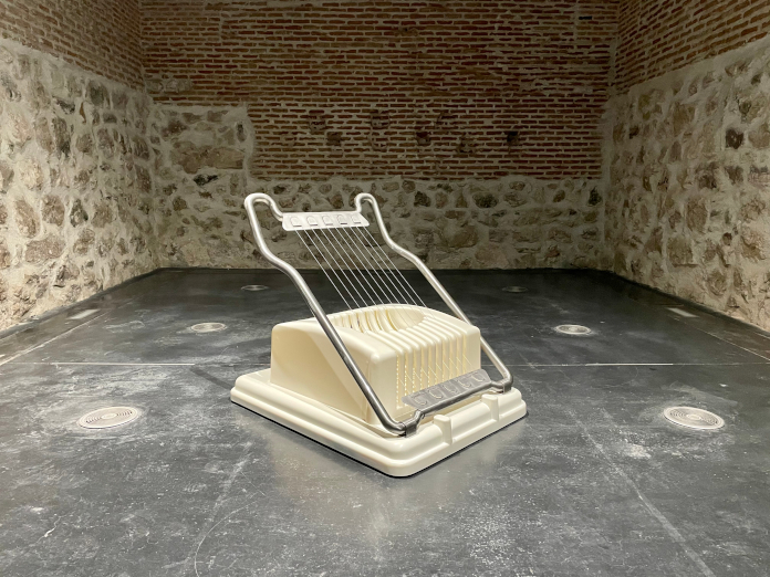 Slicer, de Mona Hatoum, es un aparato manual de cocina para trocear huevo llevado a un tamaño en que se convierte en una especie de instrumento de tortura. Esa metáfora de cómo lo que a escala doméstica es asumible, pero multiplicado por los habitantes del planeta se convierte en una elección catastrófica, me parece especialmente acertada. De grandes dimensiones es también Ni principio ni fin, un paisaje a la deriva, de Françoise Vanneraud, que recrea una serie de sistemas montañosos de los que se desgajan hielos alpinos y lenguas glaciares, exactamente lo que está sucediendo.
