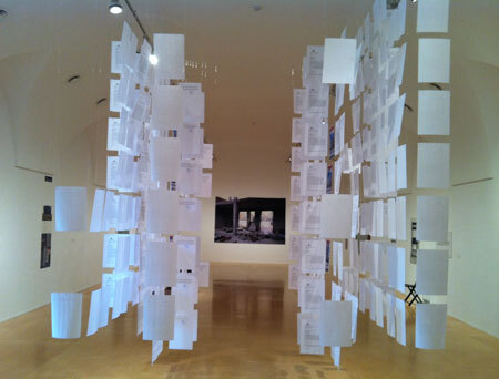 El título de esta exposición del Reina, Castillos en el aire está tomado de la obra homónima que el artista ha realizado específicamente para la muestra. Haacke quiso explorar de cerca el Ensanche de Vallecas, cautivado por su singular urbanización en los sucesivos traslados en taxi desde el aeropuerto hasta el centro de Madrid. Cuenta el artista el shock que le produjo ver cómo la zona estaba perfectamente habilitada para la vida (con bancos, farolas, árboles...) y sin embargo, ¡carecía de edificios!! Un acercamiento más atento le llevó a descubrir que en las señales de nomenclatura de las calles rezaban nombres del tipo "Arte Conceptual", "Escuela de Vallecas", "Arte Expresionista". Debió quedarse totalmente paralizado ante el modo en que se hermanaban la burbuja artística, algo que ha venido tratando con profundidad sangrante durante décadas, y la burbuja inmobiliaria española, la que ha producido una de las mayores crisis económicas que se recuerda. Haacke ha creado un proyecto específico en el que plantea un recorrido visual por esos lugares desiertos en la que la vida es sencillamente inexistente a partir de metraje de vídeo y mediante fotografías que cuelga irónicamente de cuerdas como si fueran ropa tendida que, en la realidad, no tiene de donde ser colgada... En una segunda sala, dialoga el material documental del proyecto con obras de la colección del museo de los periodos que pretenden enaltecer los nombres de las calles. Al parecer, Haacke supo que la zona pretendía ser un lugar activo para artistas, con estudios baratos y condiciones idóneas para la creación... Las caras de los presentes en la rueda de prensa no era ningún poema. Era la cara de siempre, porque a nadie sorprende ya la miserable gestión política de nuestras ciudades.