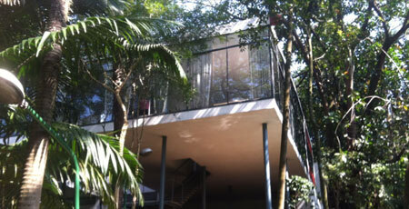 El título O interior está no exterior, que es la aportación de Douglas Gordon como en su día lo fue Everstill-Siempretodavía para la exposición en la Huerta de San Vicente de Lorca, está íntimamente ligado a la casa de Lina Bo Bardi, que encontró en este paraje un lugar idóneo para entablar una relación con la naturaleza desde la arquitectura. Quería la italiana fundirse con lo natural sin olvidar que la premisa esencial de la arquitectura es la de dar cobijo. El resultado es de una sencillez deslumbrante, con los muros de cristal totalmente abiertos al exterior y con la sensación de que la riquísima vegetación que rodea la casa se inmiscuye en el espacio doméstico. Lina, que era mujer del prestigioso historiador del arte Pietro Maria Bardi, construyó la casa en el año 1951, un lustro después su llegada a Brasil procedente de su desvencijada Italia natal.