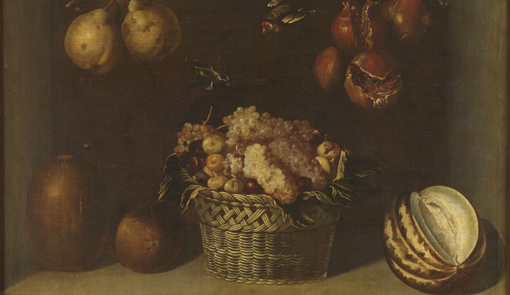Bodegón con cesta de uvas y otras frutas de Alejandro Loarte, 1624.