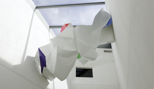 Con esa idea en mente emprendemos el recorrido. Juan López (Alto Maliaño, Cantabria, 1979) se instala en una de las paredes de la entrada del centro con uno de sus trampantojos, esta vez titulado Low, Middle and Upper Cuts (2015) que produce un juego de inestabilidad visual en el que el muro parece descolgarse. En la entrada, vemos también el trabajo de Carlos Maciá (Lugo, 1977), así como en el pasillo de acceso a la cámara acorazada, pensada en origen para custodiar el archivo de Lorca. Allí ha instalado Pasadizo, una de sus esculturas aéreas, realizada en aluminio. Maider López (San Sebastián, 1974) ocupa el auditorio convirtiendo el telón en protagonista de una performance previamente grabada por la artista, y proyectada durante el tiempo de la muestra.