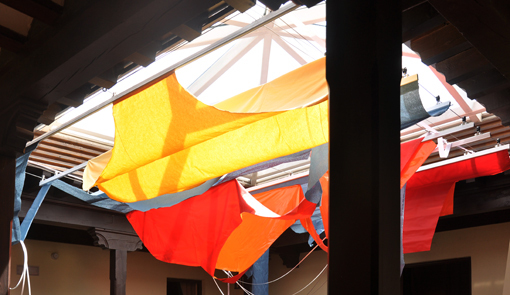 Y parece que la cosa funciona. Las piezas más teatrales las encontramos en la Casa Natal de Cervantes, su supuesto lugar de nacimiento. Todo el conjunto es una suerte de escenario, de representación, en cuyo patio Leonor Serrano (Málaga, 1986) ha sustituido el toldo por uno nuevo en el que incluye elementos verticales que lo acercan a un telón. La instalación tiene vida propia: Cada día los vigilantes de sala la mueven en función del sol que va dibujando distintos patrones sobre el suelo. Junto a ella, el dúo PLAYdramaturgia ha editado dos publicaciones en las que proponen a los visitantes acciones que pueden hacer en el espacio, como ponerlo a la venta en idealista.com.