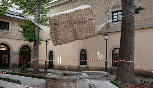 La Plaga de Eugenio Ampudia (Melgar, Valladolid, 1958) arrasa la fachada del Teatro Real Coliseo Carlos III: una instalación realizada con tarjetas de invitación de distintas exposiciones que simulan moscas que han colonizado el espacio cultural. Y Luis Úrculo (Madrid, 1978) juega a ser mago y hace desaparecer con una tela impresa la estatua de Crispín de la Plaza Jacinto Benavente (Bajar de resolución n° 1, 2017). Son las dos últimas cruces de un nuevo mapa que la galería Max Estrella dibuja para El Escorial, solo durante este fin de semana. "Con los medios con los que hemos contado, no podíamos prolongarlo más. Pero si esto es el germen, el precedente para una colaboración más amplia me doy por satisfecho", añade Alberto de Juan.