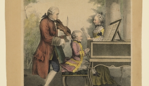 Lois de Carmontelle (1717-1806), Leopold Mozart, Maria Anna Mozart y Wolfgang Amadeus Mozart, 1764. Litografía coloreada a mano. V&A: S.2928-2009. © Victoria and Albert Museum