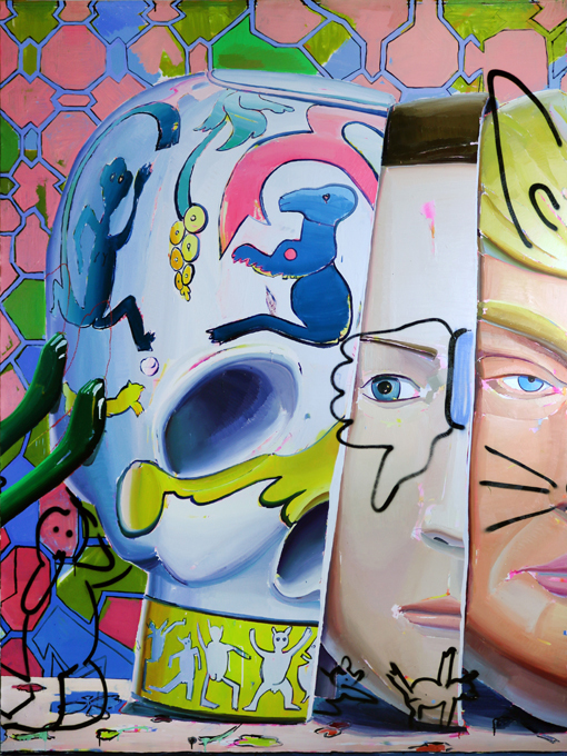 R. La cerámica es una parte indispensable de mi pintura, es la materia prima de mis principales modelos y la llevo al lienzo en cada figura que pinto. En De animales a dioses he sacado la imagen de los ángeles de una vasija de La Cartuja. También he reinterpretado el fondo del lienzo a través del patrón original de los azulejos del refectorio, usando fragmentos de los colores azul, verde y rosa. Para mí estos colores tienen sus significados: el rosa es dulce, lúdico, femenino y sensual. El verde, es el color de las piedras preciosas, muy utilizado para representaciones religiosas, mágicas y espirituales. Y el azul -que es el primer pigmento artificial que se creó, en el antiguo Egipto, murió con los primeros romanos y revivió en Pompeya- es la resurrección.