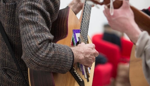 Martin Creed tocando la guitarra que ha diseñado. Foto: Belén de Benito