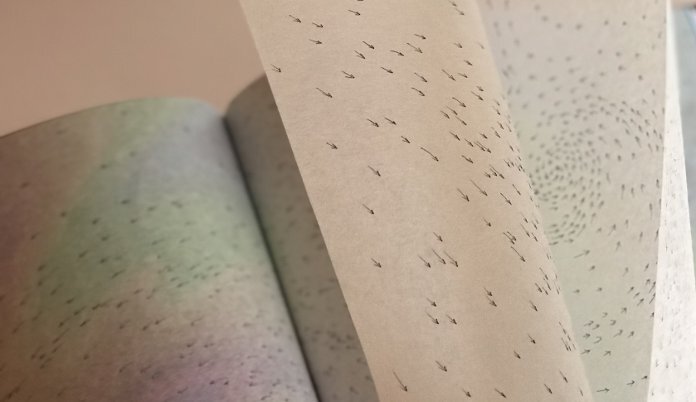 »Las transparencias de los papeles japoneses de bajo gramaje hablan de repetición y transformación, los papeles vegetales de distintos colores tiñen los contenidos de las páginas con las que conviven en el pliego adyacente, hay elementos pegados que invitan a tocar, páginas que se amplían y se abren expandiendo los propios límites del formato del libro, pop-ups tridimensionales que aparecen al pasar las páginas, espejos que reflejan la imagen del espectador, vinilos que aparecen y desaparecen, perforaciones que comunican anversos y reversos de páginas y establecen canales entre sus contenidos concatenando visualmente y teóricamente apartados, e insertos de otros libros que funcionan como pequeñas llamadas de atención para complementar el discurso. En fin, multitud de detalles y una sola obra. Se ha pretendido que la percepción del libro se convierta en una experiencia multisensorial para potenciar la complejidad del tema que trata. El tiempo de disfrute también es importante. Hace falta dedicarle mucho tiempo al libro para poder saborearlo, olerlo, sentirlo.