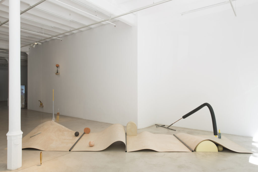 Julia Fuentesal (Huelva, 1986) y Pablo Muñoz de Arenillas (Cádiz, 1989) abordan su trabajo desde el juego, en un ejercicio muy táctil de dobleces, deslizamientos y perforaciones en el que siempre subyace la autoría compartida. Muchas de sus piezas se miran, en espejo, en moldes de tela que se repiten, tableros con piezas de madera que crean formas recortadas o en delgadas siluetas que se dibujan en el espacio. Hay una mirada atenta a las técnicas manuales visible en cómo tratan la madera o emplean los materiales que les rodean en el estudio –papel, cartón, crayón, grafito, madera, grapas, telas, latón…–. Sus piezas llaman al tacto, a la interacción. En GameShow, por ejemplo, invitaban al público de la Blueproject Foundation de Barcelona y de Circuitos, en Madrid, a tocar y apilar a su antojo una montaña de piezas de madera de haya de resonancias artesanales.