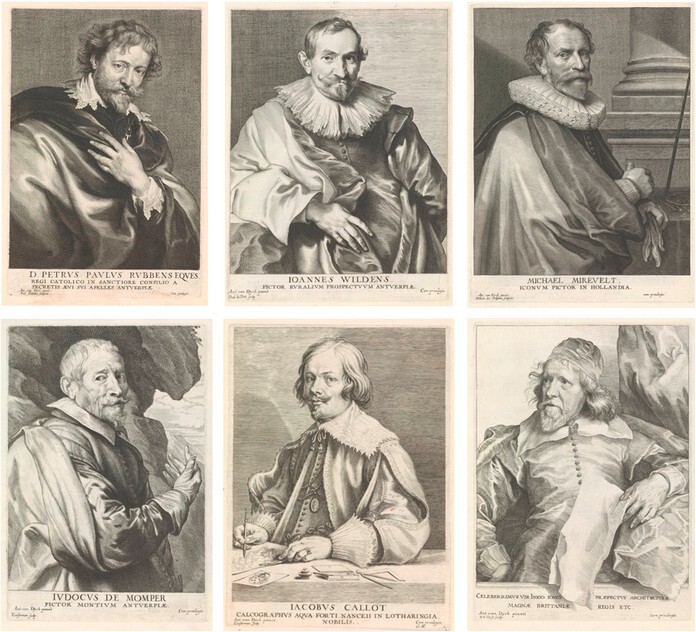 Antes de pasar a ese período que se inaugura a mediados del XVIII, marcado por la emergencia de lo que hoy llamamos “público”, hay que recordar que en 1627, cuando Pacheco había avanzado ya mucho en su proyecto, emprendía otro comparable uno de los más grandes retratistas de todos los tiempos, Anton van Dyck, con los trabajos de dibujo y estampa para su IconografíaSu estrategia era básicamente la de consolidar su fama y el estatus de caballero que había envidiado en su maestro Rubens y en los pintores de la corte de Mantua y, más obviamente que en Pacheco, la inclusión de nobles, militares, gobernadores y eruditos junto a los coleccionista y artistas, que eran mayoría (67 de 100) tenía como objetivo dar brillo social a los de su gremio. Se trata sin duda del primer conjunto de este tipo con elevado valor artístico en los Países Bajos ya que, a diferencia de publicaciones anteriores también importantes como el Pictorum aliquot celebrium Germaniae inferioris effigies (Amberes, 1572) de Dominic Lampson y el Pictorum aliquot celebrium praecipuae Germaniae inferioris effigies  (La Haya, 1610) de Hendrick Hondius, que reutilizaron estampas anteriores, Van Dyck fue el autor de la mayoría de las semblanzas.