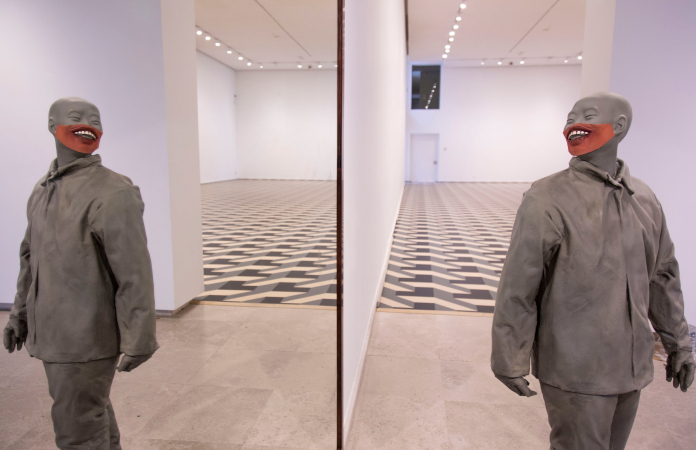 En la planta de arriba, un personaje está delante de un espejo, muy parecido a los que ahora pueden verse en la galería Elvira González de Madrid. Con una risa nada disimulada, mira a través de la superficie brillante, haciéndonos conscientes de nuestra condición de espectadores y, a la vez, integrándonos en la pieza, porque quizás se esté burlando de nuestro reflejo. La cuarta pared, que nos separaba de la escena, queda definitivamente rota cuando se entra en esa plaza con un suelo óptico en la que se ha convertido la última sala. Allí nos observan desde sus balcones unos desmadejados personajes de fieltro. Se ha invertido la relación entre el que mira y el que es mirado, el espectador y el espectáculo, o al menos, esa es la ilusión que termina creando Juan Muñoz. Al final, somos un personaje más de los que imaginó en esas obras que recuperaron las estrategias del barroco y algunas tácticas del romanticismo, para redefinir lo que se consideraba escultura. Recorran también el claustro. Allí encontrarán algunas sorpresas más. A veces, es mejor no descubrir todo lo que se puede esperar. El telón se cierra.