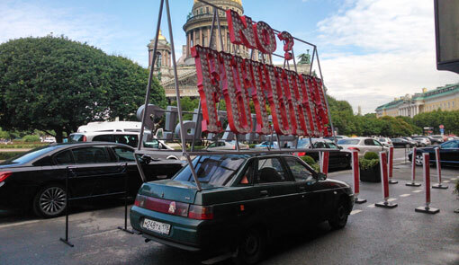 Las obras se distribuyen en dos sedes, el complejo palaciego y la extensión del museo al edificio administrativo, que se inaugura ahora (y qué mejor publicidad internacional que con la bienal) al otro lado de la gran plaza. En el palacio, que mantiene a pesar de la gran inversión en la nueva ala su espeluznante museografía (¡esas cortinas drapeadas!) y la preocupante conservación de las obras, sorprende que la mayoría de los artistas hayan trabajado no sobre los acontecimientos o las ideas que han marcado y marcan su historia sino sobre elementos ornamentales.Tras los pasos de la resultona pareja Piranesi/Louise Bourgeois, así lo han hecho Katharina Fritsch, Karla Black, Tatzu Nishi, Marc Camille Chaimowicz e incluso una artista habitualmente más combativa como Lara Favaretto. No voy a perder líneas describiendo las obras porque tienen en nuestra web una completa galería de imágenes. Sí quiero destacar, por su reflexión sobre otras épocas en el palacio, los proyectos de Yasumasa Morimura y, sobre todo, de Susan Philipsz, que evoca, con elementos literarios y musicales, la subida del río Neva y la entrada de los revolucionarios al Palacio de Invierno. Incoherentes pero pertinentes: los retratos de grandes hombres homosexuales de Marlene Dumas y el desnudo en una escalera de Richter, situado, supongo que con mucha intención, justo a espaldas del trono del zar, sobre una pequeña escalinata.