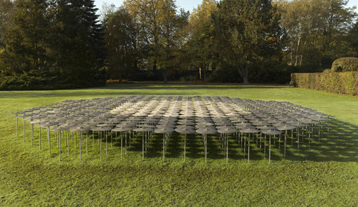 En el exterior del pabellón, una instalación realizada con platillos metálicos sigue la trama de la mezquita de Al Aqsa en Jerusalem. Dispuestos sobre listones metálicos, los platillos evocan cierta vegetación, como un bosque que fuera azuzado por los agentes climatológicos. Hacía bueno cuando los visité, pero imagino la conmovedora gravedad del sonido de la lluvia al golpear los platillos.