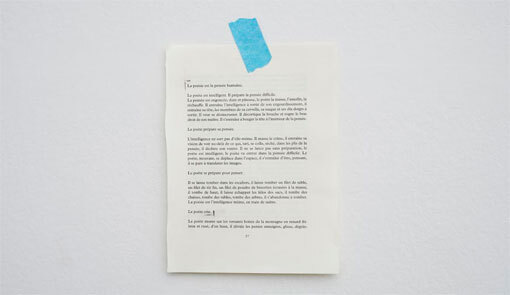 En torno al cubo, Désanges propone un diálogo entre las obras de arte y las formas poéticas, hojas que parecen arrancadas directamente de los poemarios y que aparecen pegadas con cinta adhesiva a bancos de aluminio. El montaje es impecable, balístico, y el modo tan pedestre de montar las hojas de poesías y también las cartelas -que parecen seguir toscamente la técnica del recorte- responde a la voluntad de enturbiar la luminosa clarividencia balística a través de sustrato inefable de la poesía.