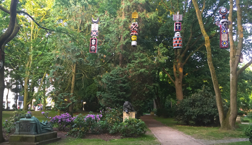 Muy ligada también al lugar, teniendo muy en cuenta la especificidad de su localización, el camerunés Hervé Youmbi ha realizado una intervención en el cementerio cristiano cercano al castillo de Münster. El suyo es un diálogo entre las fuertes raíces simbólicas de las creencias religiosas africanas y las de la cristiandad con las que investiga las fuertes tensiones entre lo local y lo global. Su proyecto consiste en una gran instalación con ocho grandes esculturas que cuelgan de otros tantos árboles. Cada una de ellas está realizada con madera en la que el artista ha incrustado cuentas de cristal siguiendo la tradición ornamental del oeste de su país. "La intervención se sitúa en un lugar muy particular. Es un pequeño cruce de caminos en el cementerio, donde se encuentran dos grandes mausoleos. Uno de ellos tiene una escultura de un hombre yacente y el otro una de un león durmiente. Mis esculturas colgando sobre los mausoleos tal vez inviten a pensar en los sueños del hombre y del león o quizá en las almas de quienes descansan dentro de los mausoleos. Creo que puede ser una yuxtaposición interesante. Mis esculturas tienen, también, en sí mismas, componentes heterogéneos. Parten de la tradición religiosa de mi país, sí, pero también tienen connotaciones ligadas a la cultura occidental, como El Grito de Munch y la revisión que de este cuadro hizo Wes Craven en su película Scream"