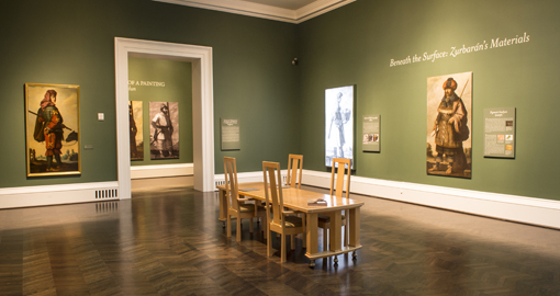 Mientras hace obras, ha llevado los zurbaranes a Dallas, donde el equipo del vecino Kimbell Art Museum en Fort Worth los ha estudiado en detalle, constatando que, aunque obras de taller, hay mucha mano del maestro en ellos, y donde el Meadows, una institución de referencia mundial en arte español, los presentan al público y -muy estratégico- a los mecenas estadounidenses. Para que no extrañen su casa, se ha evocado en el museo de la universidad metodista texana el comedor de Auckland Castle, con un papel pintado de Zoffany. Se han presentado sin respetar el orden de nacimiento de los hermanos, juntos todos de nuevo tras una larga separación de Benjamín, que vive en Grimsthorpe Castle, Bourne (Lincolnshire). En las salas vecinas se muestran algunos de los grabados que sirvieron de fuente a Zurbarán, algunos documentos que crean un somero contexto histórico y los resultados de los estudios técnicos realizados. Hay además un completo catálogo editado por el Centro de Estudios Europa Hispánica, que pone al día lo que sabemos sobre estas obras.