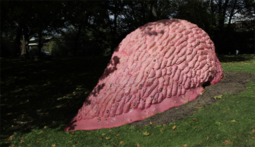 Respuesta.- Sí. Lleva por título Pumping Station [estación de bombeo] y propone un canal de comunicación entre lo enterrado, lo que lucha por salir y la propia superficie de la Tierra: una cosa supurante, un animal viscoso, una lengua que está saliendo a la superficie. Quería trabajar esa idea de epidermis sintética, o como diría Cronenberg en Videodrome, de trabajar "la nueva carne". La piel de esta obra es brillante como un capó de coche y bulbosa como una lengua vista a través de un microscopio.