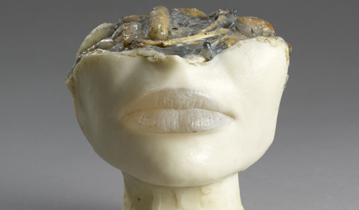 Los diez años que median entre Pierna y la muerte de Szapocznikow en 1972 son años de una producción febril, en los que introduce pautas iconográficas a medio camino entre la tradición surrealista y la estética Pop. Hay una creciente sensualidad en las formas humanas que persisten en su caracter fragmentario y apelan intensamente al deseo (los ecos de Bataille se escuchan con nitidez). Sus superficies son de una viscosidad casi obscena que resultan de la utilización de resinas y otros materiales dúctiles y traslúcidos, como gasas y telas. En algún momento, la artista coqueteó con el diseño y creó lámparas con forma de rostros, pechos, labios… Son más decorativos y pierden intensidad. Lo que despierta mi interés de esos años es el modo de mezclar elementos industriales con moldes de su propio cuerpo, como en Goldfinger (1966), basado en la película homónima. La pieza de un motor de coche se funde aquí con la ilusión de lo mórbido, en clara prefiguración de la obra de artistas contemporáneos como Nairy Baghramian, de quien hablamos no hace mucho en estas páginas, autora de raras formas que semejan prótesis dentales.