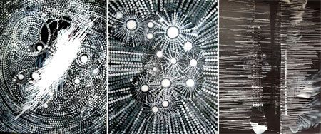 En cada conjunto de obras hay una secuencialidad (menos perceptible en el montaje) y un lenguaje cifrado, estelar o microbiológico, que se comunica por pulsos (los destellos circulares) y por diagramas (las "curvas" de los drippings). Atentos a esos mudos y azarosos mensajes.