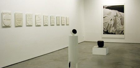Las otras obras consisten en dos lienzos enormes pintados al óleo que representan literalmente un grumo de pintura y varias pinceladas sobre una superficie lisa, recortada la imagen y realizada con tal precisión que se finge fotografía, y una sucesión de esculturas en las que el papel protagonista corresponde al pedestal. Esa pesquisa que inició hacia 2003 y que sigue vigente, reproduce en su superficie una vista cenital del Museo Reina Sofía. Sobre la imagen del patio del museo reposa una piedra cúbica hecha de óleo negro amasado. El patio de un museo para un pringoso baño de óleo. Susurros de imágenes que subvierten el pensamiento establecido sobre las instituciones del arte.