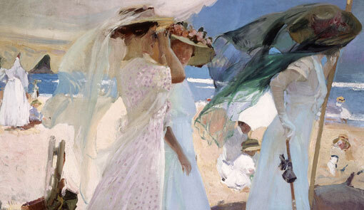 El relato se inicia recordando al Sorolla costumbrista y realista que ya había triunfado en París y Londres, para pasar directamente a destacar la importancia que tuvo su mecenas Archer Huntington, fundador de la Hispanic Society de Nueva York, quien organizó en 1909 su primera exposición en Estados Unidos, donde se exhibieron 356 obras, que recibió 160.000 visitantes en un mes y de la que se vendieron 20.000 catálogos, antes de que itinerara a Bufalo y Boston. Entonces, Joaquín Sorolla y Bastida (1863-1923) tenía 46 años y estaba en la plenitud de su carrera. Impartió conferencias, vendió los retratos familiares que había llevado como reclamo para los numerosos encargos que, de hecho, recibió. En Washington, llegó a retratar al presidente de Estados Unidos, William Howard Taft, como ya antes había retratado en España a la reina Victoria Eugenia y al rey Alfonso XIII. Su éxito, también cifrado en una suma millonaria en ventas -que contribuiría a la construcción de su casa-museo en Madrid-, alentó las exposiciones que se celebrarían dos años más tarde en The Art Institute of Chicago y en el City Art Museum de San Luis, además del encargo de la biblioteca de la Hispanic Society, en el que se empeñaría casi una década y cuyo desgaste anímico y físico le precipitaría a su fin.Sin embargo, Huntington no fue su único mecenas. El retrato del magnate Thomas F. Ryan da lugar a un interesante excursus sobre la influencia de Sorolla en la construcción de la identidad mediterránea de California y su joven tradición pictórica. En la exposición, es muy interesante la galería de estudios preparatorios para La partida de Colón, donde comprobamos la rapidez y amplitud con que trabajaba el pintor. Y son inolvidables, por sus pinceladas libres, los cuadros inspirados en Andalucía, ahora propiedad de la Fundación Getty.La últimas ala cierra con escenas de playa, como no podía ser menos … Por tanto, otra vez mucho y nuevo del gran Sorolla en plenitud, para disfrutar hasta quedar cegados, entre sus manchas y su luz.