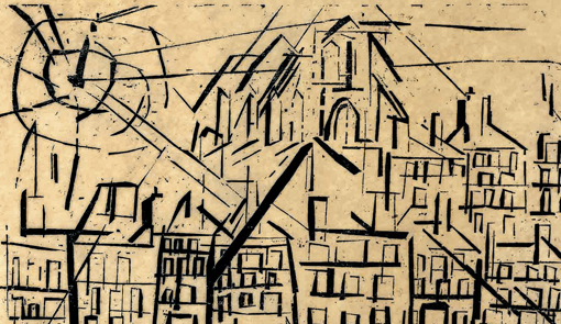 Ciudad con iglesia iluminada por el sol, 1918 (detalle)