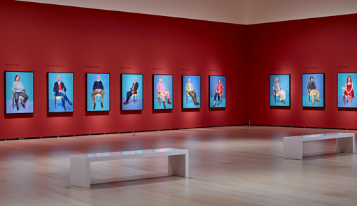 Todo lo que hemos mencionado hasta el momento lleva a una idea, la de uniformidad. No es Hockney el primero en utilizarla. En un ámbito que él ha utilizado con frecuencia, como es el de la fotografía, es habitual este planteamiento seriado. Philip Halsman hacía saltar a sus fotografiados, Irving Penn los colocaba ante dos paneles que construían un ángulo profundo, Richard Avedon, casi siempre contra un fondo neutro. El resultado es una cierta negación de la individualidad, mediante la repetición, al tiempo que se señala esa misma personalidad a través de elementos como la descripción física, la expresión o la vestimenta (para Hockney los zapatos son algo que dice mucho de quien los lleva). Pero el proceso mismo de construcción de la serie va introduciendo pequeñas diferencias. El retrato inaugural es el de su asistente durante muchos años, JP Gonçalves de Lima, y en él JP (como le llama coloquialmente el artista) aparece con la cabeza entre las manos y el rostro oculto, en clara referencia al cuadro de Van Gogh Anciano en pena. (En el umbral de la eternidad), 1890. A los pies del modelo, una alfombra con dibujos geométricos en rojo y azul. El momento en que Hockney pinta ese cuadro coincide con la muerte inesperada de Dominic Elliot, uno de los ayudantes del estudio, por lo que puede inferirse que, en realidad, JP está manifestando el dolor del propio pintor y su entorno por la muerte de Elliot.Ese primer cuadro marca las características de la serie, salvo el detalle de una alfombra, con dibujos geométricos en rojo y azul, que desaparece en los retratos posteriores. Y añade dos nuevos elementos: el trasfondo psicológico del personaje y la proyección del propio artista en el retrato. La galería incluye únicamente a personas relacionadas con Hockney y a quienes, lógicamente, el artista conoce bien, pero ese conocimiento produce una interacción entre las características del retratado y el efecto que éstas han producido en el pintor. Hockney resuelve el problema en clave expresionista, combinando la minuciosa reproducción del color de unos pantalones, por ejemplo, con la deformación de ciertas partes del cuerpo humano. Los ojos de Chloe McHugh son totalmente azules, esclerótica incluida; los zapatos de Jacob Rothschild demasiado grandes en relación a su cabeza y el comediante Barry Humphries aparece como hinchado, con una cabeza desproporcionada al resto del cuerpo. En otros retratos, el espacio de la parte inferior del cuadro se viene hacia delante, recordando los bodegones de la última etapa de Cézanne. En esa aparente contradicción entre rigidez formalista y libertad expresionista se mueve una galería que abarca desde la cocinera y mujer de la limpieza de Hockney a sus hermanos Margaret y John, a artistas como John Baldessari, o Edith Devaney, comisaria de la exposición.