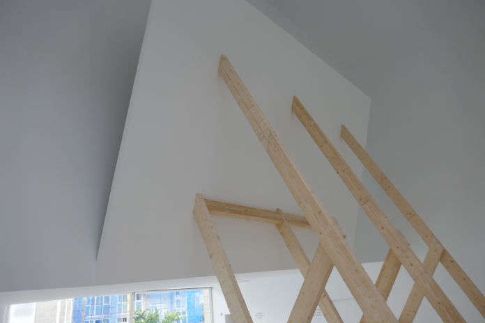 Fuerzas ascendentes como ramas de árboles se alzan por los muros del museo en dos piezas que harán historia en el centro. La primera, Falling Wall (1993-2021), situada en el vestíbulo, es una instalación site specific que se despliega alzada en el espacio, una pieza que nunca se había montado a tanta altura y que evoca un muro que parece desmoronarse sujeto por un andamiaje de madera sin tratar, como troncos de árboles. Comparte ascensión mística con la magia que sucede en el Doble Espacio del museo; aquí se encuentra Corner Piece (1966-2021) una vibrante instalación que señala un metaespacio en una de sus esquinas con forma de afilada pirámide invertida como la que actualmente se muestra en la colección permanente del MoMA. Su solemnidad, sencillez, serena belleza e inteligencia la convierten en una de las piezas más hermosas que he visto en ese espacio. Además dialoga con una escultura minimalista situada en la pasarela, Relationships Between Volume, Space and Gravity (1965-2008) que, aunque es un estudio sobre el equilibrio y la gravedad, funciona dramáticamente como un ángel abstracto.