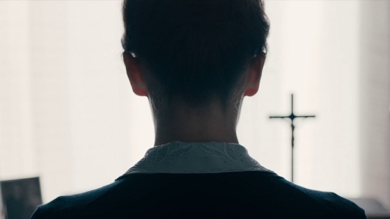 Sirva este preámbulo para hablar sobre Mrs. Wilson, nueva producción de la BBC que, desde el pasado 7 de mayo puede verse en España a través de Filmin (de hecho, ha sido el estreno más visto de la plataforma en los últimos dos años). La serie, basada en la verdadera historia de Alison Wilson (Ruth Wilson: la coincidencia en el apellido no es casual), arranca de la siguiente manera: un plano medio de la nuca de una mujer -observamos la parte superior de la espalda y casi toda su cabeza- y, en segundo término, sin profundidad de campo, un fondo difuso en el que se distinguen una fotografía a su izquierda y un crucifijo y un flexo a su derecha (ver foto). También se intuye el borde de una mesa y, detrás, una ventana con las cortinas corridas por la que se filtra la luz procedente del exterior. El vestido negro de la que, posteriormente, sabremos que es la protagonista, contrasta con la blancura lumínica que entra a través de los cristales. Podemos hablar aquí, siguiendo la tesis de Huerta, de una semilla visual que se constituye como metáfora de esta alambicada mini-serie, entreverada de melodrama familiar y relato de investigación.