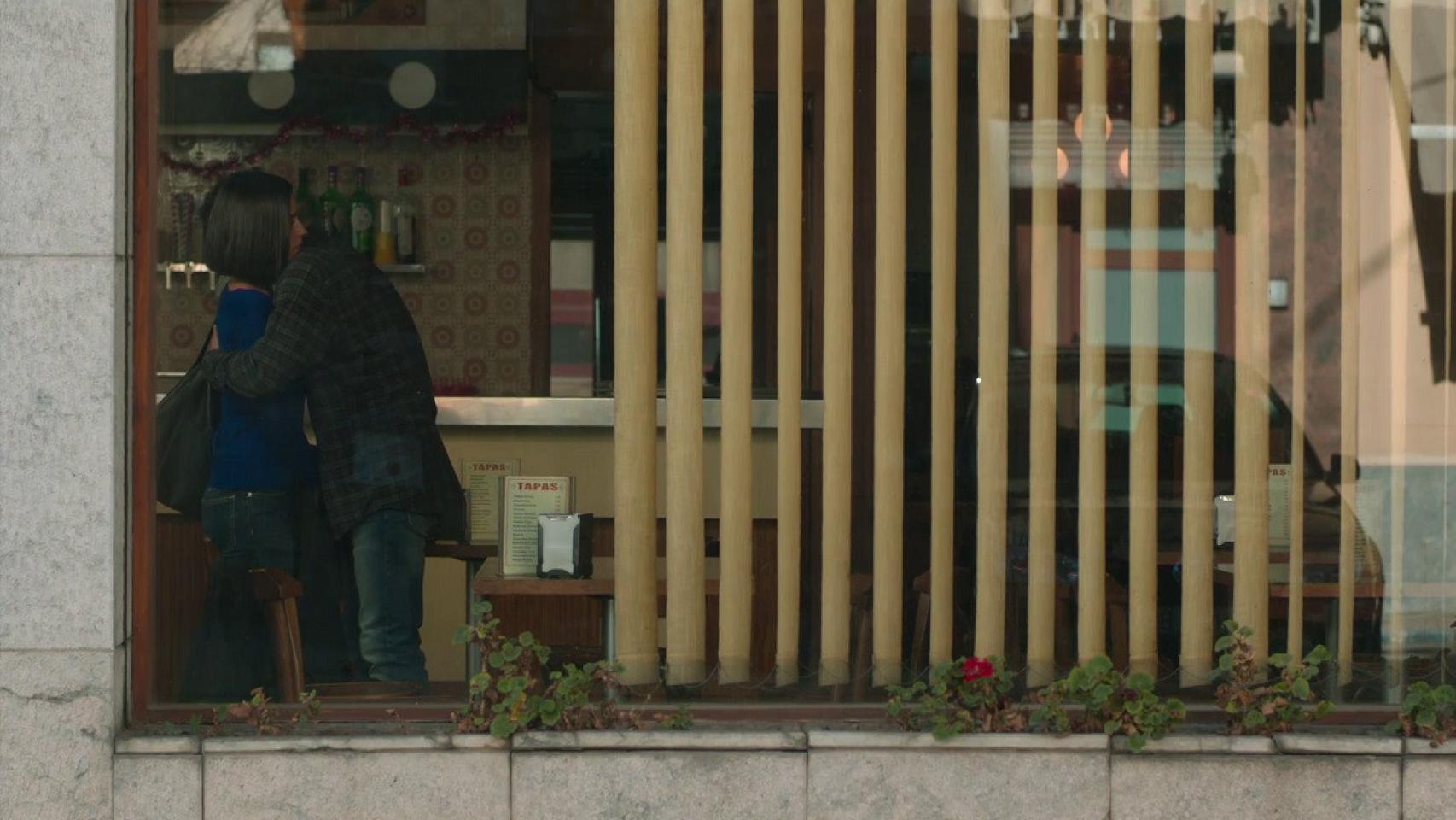 Cerremos este análisis hablando de una de esas secuencias que te encienden la señal de alerta en los ojos, de esas que invitan a activar la intuición de que uno se encuentra ante un fenómeno digno de atención. Nos referimos a la del reencuentro entre Enric e Irene, situado al inicio de ‘Instrucciones divinas para salvar el mundo’ (1.04). Se citan en un bar. Vemos una toma de espaldas de Enric y mediante un travelling hacia adelante y la paulatina aparición de un brazo en la parte izquierda del encuadre percibiremos la llegada de Irene. Le saluda (“hola”) y un corte de montaje nos lleva a un plano general filmado en un insólito escorzo (foto superior) que refleja, primero, la distancia que existe entre ambos y, después, la sensación de extrañeza que reina entre los dos. La siguiente decisión visual no es menos significativa. Enric abraza a Irene, impertérrita, y la cámara se situará en el exterior de la cafetería para denotar esa frialdad emocional que envuelve a los hermanos (foto inferior). Además, jugará con el reencuadre para señalar la sensación de bloqueo que atraviesan (tendrán que lidiar con su pasado para poder seguir adelante).