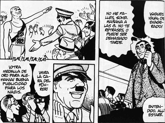 Adolf narra la historia de tres personajes llamados Adolf: Adolf Kamil, judío de padres alemanes; Adolf Kaufmann, de padre alemán y madre japonesa; y el tristemente famoso Adolf Hitler, cuyo origen esconde un misterio nunca resuelto. El escritor y periodista deportivo Sohei Toge será el punto de convergencia de las tres historias. A veces como testigo o receptor de confidencias; otras, como protagonista. En las primeras páginas, Shoei acude a visitar la tumba de Kamil en Jerusalén, concluyendo una peripecia que comenzó en 1936, cuando le enviaron a Berlín para cubrir los Juegos Olímpicos. La historia de los hombres casi siempre se escribe en letra pequeña, dejando como rastro escenarios humildes e insignificantes. En cambio, la historia de las naciones se complace en la grandilocuencia. En este caso, las estelas funerarias del cementerio contrastan con las antorchas y las trompetas de la estética nacionalsocialista. Shoei Toge advierte enseguida la inmadurez de Hitler. En Berlín descubre que sólo es un bocazas sostenido por una propaganda sofisticada. En el congreso nazi en Núremberg, ve aún con más claridad que todo es un montaje: las multitudes milimétricamente alineadas, los estandartes, la caligrafía gótica, el paso de la oca, los himnos, los uniformes de las SA –diseñados por el sastre y empresario alemán Hugo Boss–, las antorchas y los haces de luz en mitad de la noche. Hitler gesticula, vocifera y se retuerce, presentándose como la salvación de Alemania. Shoei Toge comenta con ironía: “Hitler es la estrella del siglo, y sus fans lo aclaman en su teatro”. El Hitler de Tezuka recuerda a Bruno Ganz en El hundimiento (Oliver Hirschbiegel, 2004), con sus ataques de vesania y su verborrea. Nunca se relaja. Nunca actúa con naturalidad. Su teatralidad ininterrumpida apunta un profundo vacío interior disimulado bajo una máscara histriónica.