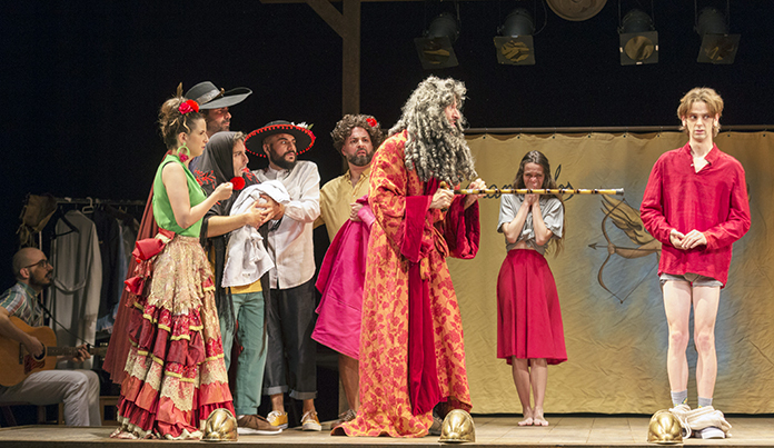 Esta producción impulsada por el Festival Iberoamericano del Siglo de Oro de Alcalá de Henares se asienta en un equipo muy familiar: si Alonso de Santos firma la dramaturgia, la dirección descansa en su hijo Daniel Alonso, que arma una puesta en escena sencilla e inspirada en las representaciones que hacían los cómicos de la legua por las plazas de los pueblos. Vemos entonces a una troupe de comediantes que sobre un tablado hacen y deshacen los pasos. El dispositivo escénico es de una gran sencillez y todo a la vista del público: unos telones que los propios actores quitan y ponen nos van anunciado cada una de los enredos cómicos de tono costumbrista que se van a representar. Los actores que no están en escena andan por las inmediaciones del tablado, al lado de las burras donde cuelgan ropajes mientras unos y otros se ayudan a vestirse. En un extremo, el músico Alberto Torres Ramos ilustra con su guitarra las canciones que ha compuesto para la ocasión y que los actores interpretan a modo de argamasa entre paso y paso.