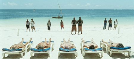 Hay un plano muy ilustrativo al respecto. Las turistas tumbadas en sus hamacas, friéndose al sol, en fila india a la derecha del plano; los nativos frente a ellos, a la izquierda del cuadro, de pie, en la playa, como si fueran los frutos prohibidos de un supermercado. Laurent Cantet se sumergió en un contexto similar en la película Hacia el sur (2005), en la que Charlotte Rampling viajaba a Haití en busca de lo mismo, pero allí donde Cantet se extraviaba en una inconsistente trama sentimental, Seidl muestra una extraordinaria capacidad para concentrar su discurso con tanta transparencia como complejidad, combinando astutamente los códigos naturalistas (diálogos improvisados, actores interpretándose a sí mismos, sin ningún asomo de autocensura, etc.) con la estilización de lo grotesco tan propia de su cine. No huye, más bien al contrario, de las situaciones escabrosas; no limita su discurso con correcciones políticas ni con implicaciones emocionales. En este sentido, el retrato que nos ofrece de África está en las antípodas de ese cine con "conciencia social" que parece dirigido por voluntariosos activistas de una ONG. Seidl es un etnógrafo con muy mala uva, un lúcido analista de los rincones oscuros del comportamiento humano, y no teme introducir en el tramo final de su película una larga orgía con contenido que roza el porno duro.
