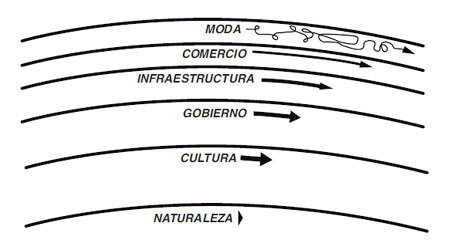 La actividad en los primeros niveles es rápida y hasta fulgurante, y es donde se producen la mayor parte de las innovaciones. A medio camino, y en el seno de los trabajos de infraestructura, fi gura el sistema educativo, cuya base es el aprendizaje del método científi co. En los últimos rellanos, las cosas son más pausadas, permanentes y seguras. Las interacciones entre los distintos rellanos sólo se convierten en crisis insuperables si no se las mira como lo que son: partes indisolubles del todo.