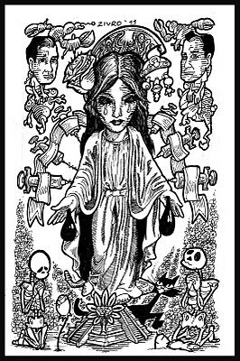 Preside la estancia, hacia la pared de la desolada cocina, desde la esquina derecha se proyecta hacia ésta, por cuyo techo de ramas y tablones podridos se filtran inefables goteras (refugio devastado por las bombas) -El icono representa a la Santa Madre asomándose bajo su manto azul, con su túnica y sus arreglos de Gran Dama, a la que El Indio dirige sus plegarias cada vez que sale a pillar algo de mierda. El Indio, supuestamente, es vendedor de baratijas -Pero yo nunca lo he visto por San Juan Letrán vendiendo crucifijos, en realidad jamás lo he visto en la calle ni en Redonda ni en ninguna parte -La Virgen María tiene encendida una vela, de esas baratas en vaso de vidrio que tardan semanas en consumirse, como las incansables ruedas de oración tibetanas que nos acercan al Buda Amida -Sonrío al ver tan adorable imagen.